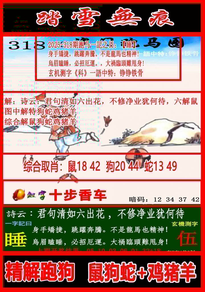 2025-318期正版彩图挂:44;挂牌:说千道万;六肖:鸡蛇虎猪鼠狗;火烧:马